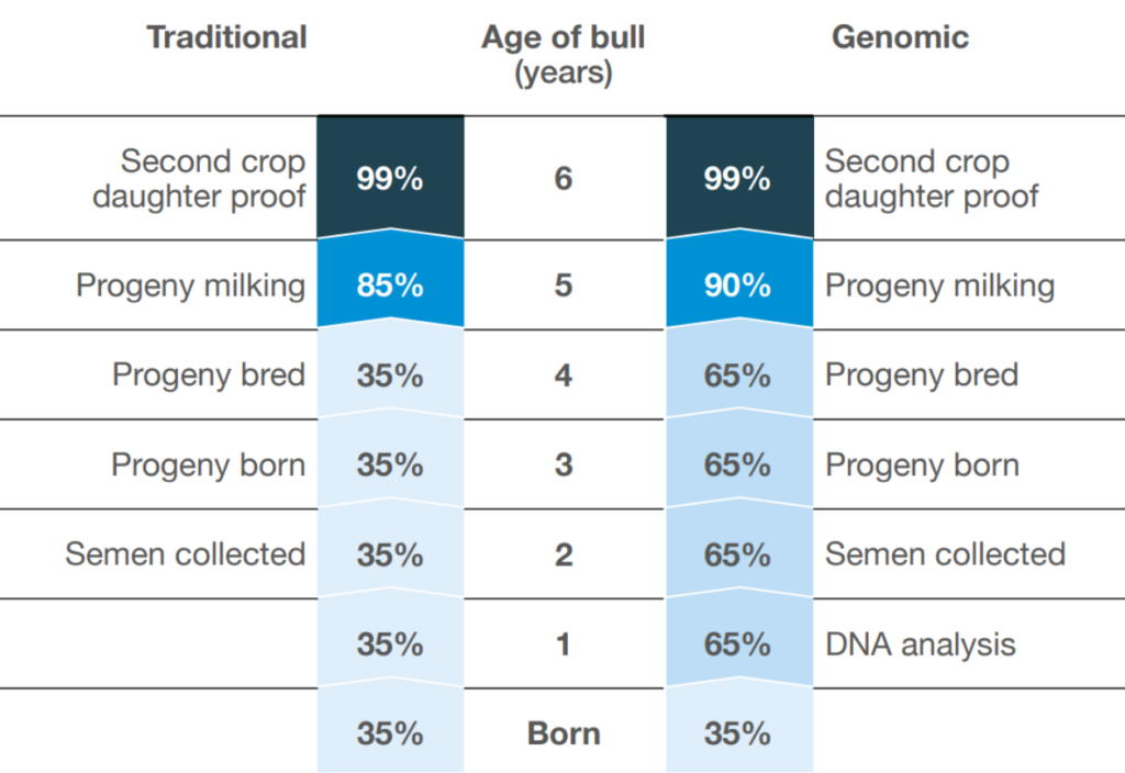 The reliability is approximately doubled in genomically tested heifers, compared to a parent average proof, allowing for more confident breeding decisions to be made earlier in the animals life and thus accelerating the genetic gain of the herd.