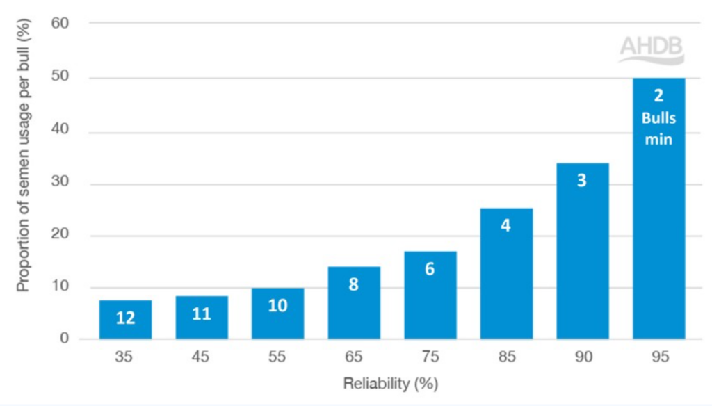 The figure below is a guide to the proportion of semen usage for a single bull depending on its reliability. The numbers within the bars indicate the minimum number of bulls at a given reliability recommended to generate a full bull team.